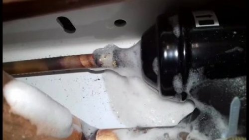 - Нанесите раствор на соединения, переходы трубок и пайки, включите холодильник и наблюдайте. Пузырение выдаёт место подсоса. Не распыляйте на электрические контакты и не пытайтесь «добраться» в запенённые зоны.