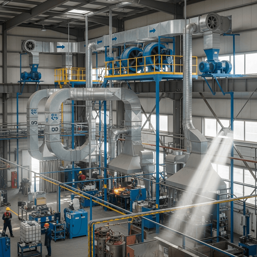 Основные задачи промышленной вентиляции. Система должна решить четыре критических задачи: во-первых, обеспечить непрерывный приток свежего воздуха во все рабочие зоны; во-вторых, полностью удалить загрязненный воздух и вредные вещества или снизить их концентрацию до допустимых по санитарным нормам значений; в-третьих, поддерживать оптимальную температуру и влажность для комфорта людей и сохранности материалов; в-четвертых, препятствовать распространению огня при возгорании и выводить продукты горения.