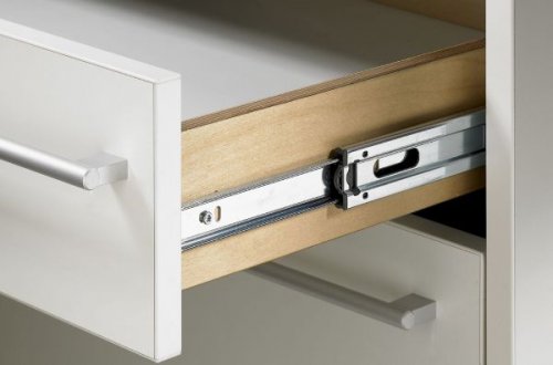 Основой служат петли и направляющие. Петли с доводчиками обеспечивают плавное закрывание дверей и снижают риск повреждений корпуса. Направляющие полного выдвижения позволяют увидеть содержимое ящика целиком, а не только его часть. Это делает доступ удобнее, особенно если шкафы узкие или глубокие. Полновыдвижные системы важны в нижних модулях, где хранятся тяжелые предметы.